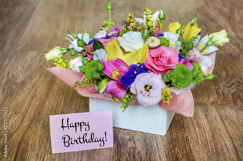 Flower Box Of Colorful Roses Freesia And Greenery With Happy